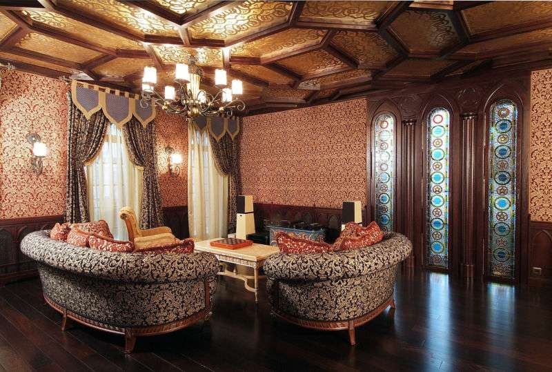 The materials used in the decoration must be of high quality and expensive. They emphasize the luxury and richness of style. The furniture is installed not only beautiful, but also comfortable. As for curtains, they should be dense.
