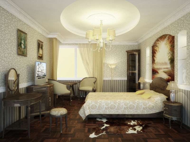 Quite often, classics are used to decorate the bedroom. But pomp and luxury for this case will not work.A hint of wealth should be humble and noble.