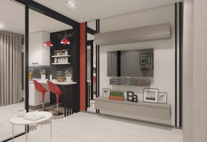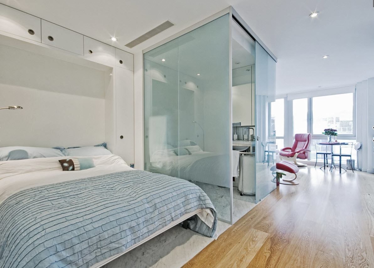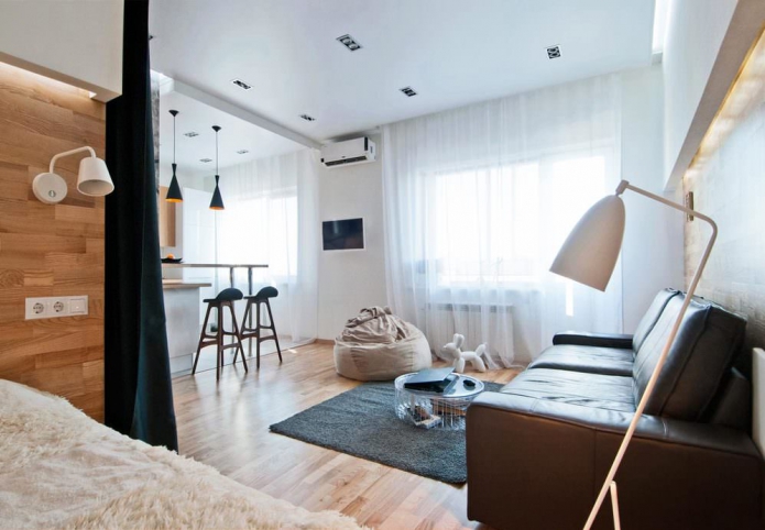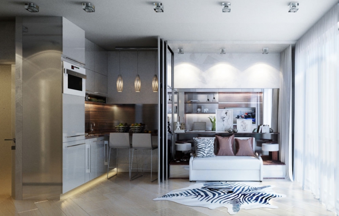 These methods are quite enough for conditional delineation of space to fit into design of a small studio apartment. Using modular furniture and all kinds of transformers (folding after use), it is easy to expand the possibilities of compact housing.