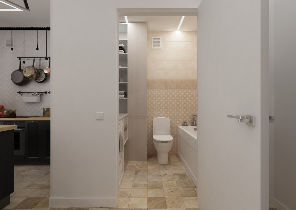 Location of this zones determined by the location of the communications. But there are some design tips for this zones. Be sure to take care of a quality hood. If you plan to cook at home, this item is necessary. It prevents odors from spreading throughout apartmentwhich is very important for studios.