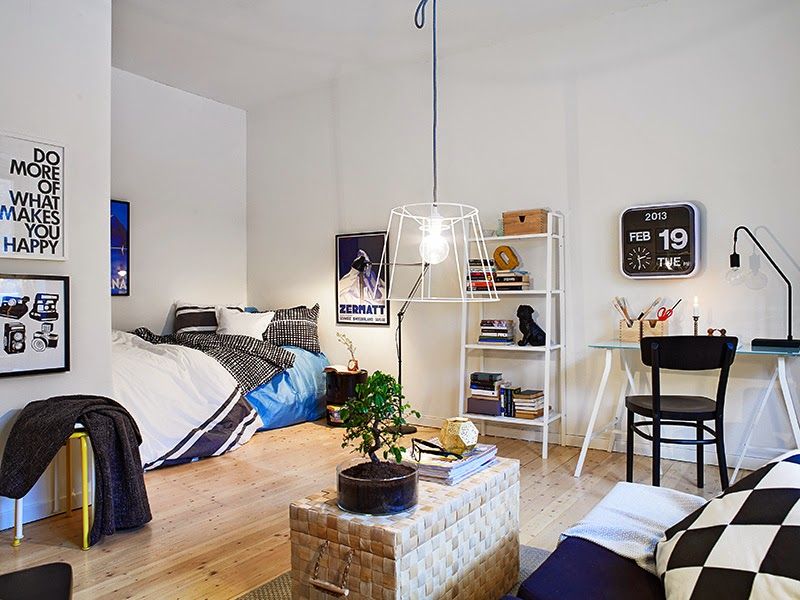 Cold and discreet. He will do small studio apartment fresh and spacious. This style uses cold tones (white, blue) as the basis, and warm (brown, yellow) to add a little warmth. The detail by which you will definitely recognize the Scandinavian direction is the fireplace. It also brings a little warmth to the severity of white snowy flowers.