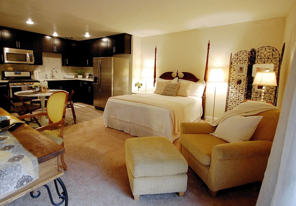 AT one-room apartment you need to fit everything you need for a comfortable life. Room can be divided into zone for rest, sleep, work, play, etc. However, we can conditionally distinguish the 2 most necessary “rooms”: this is a bedroom and kitchen. Pay attention to the conditions of their creation.