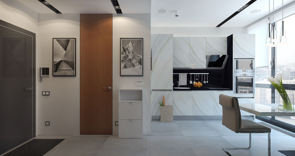 Mostly small apartments are issued in style minimalism, hi-tech.They are characterized by simplicity, the use of concise forms in the interior. Place the necessary items on a small square not be difficult.