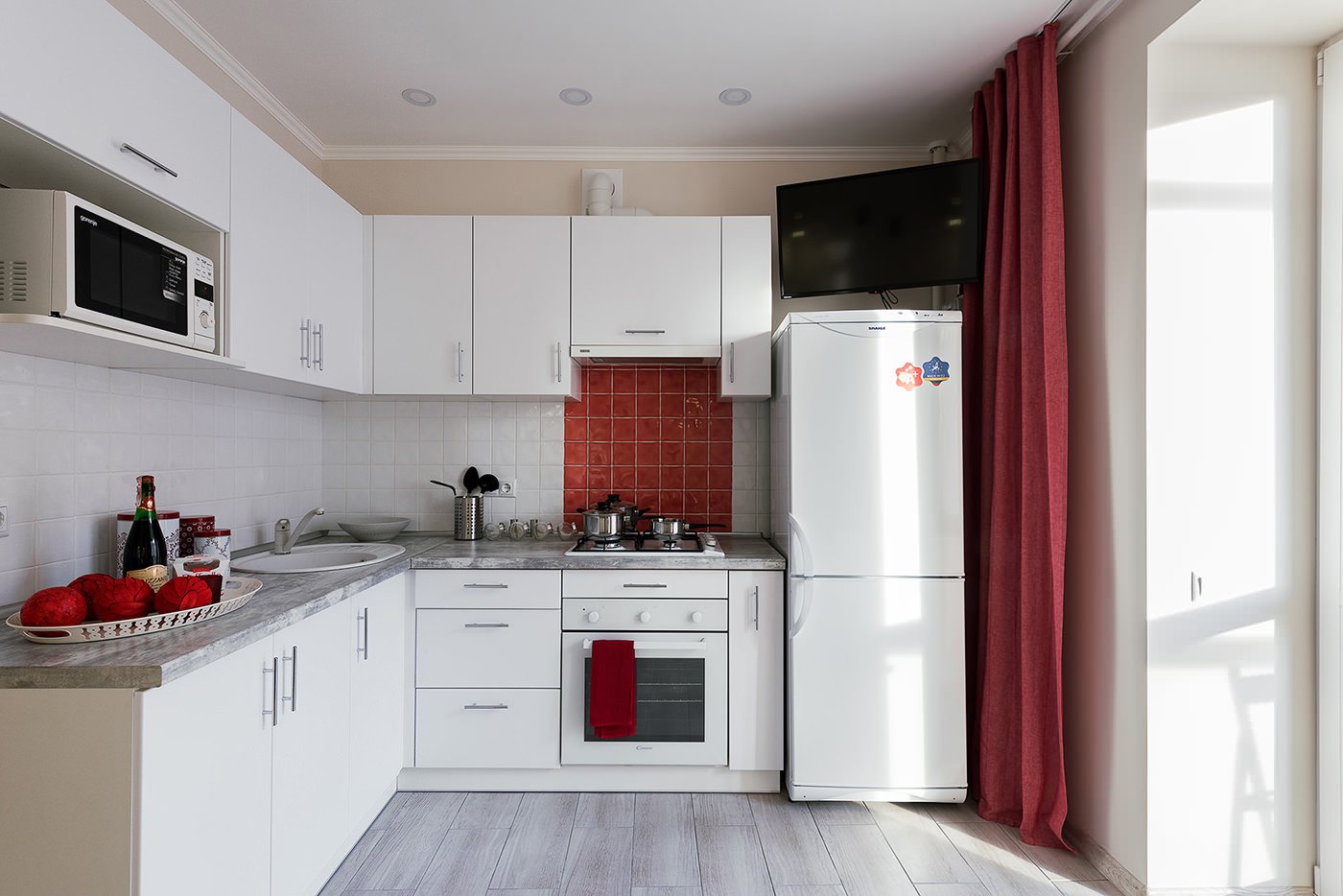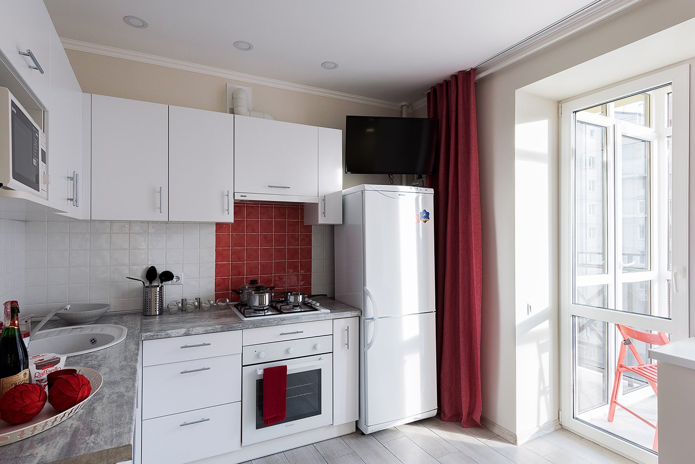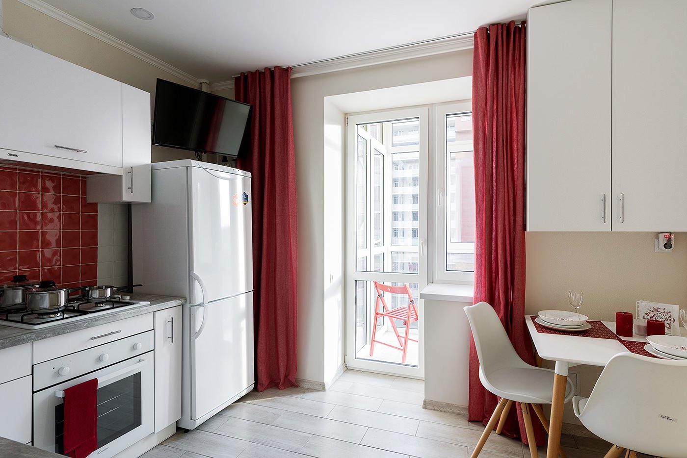The main color of the design is white. Light walls and a wooden floor serve as a wonderful backdrop for bright color accents and visually enlarge a small apartment.