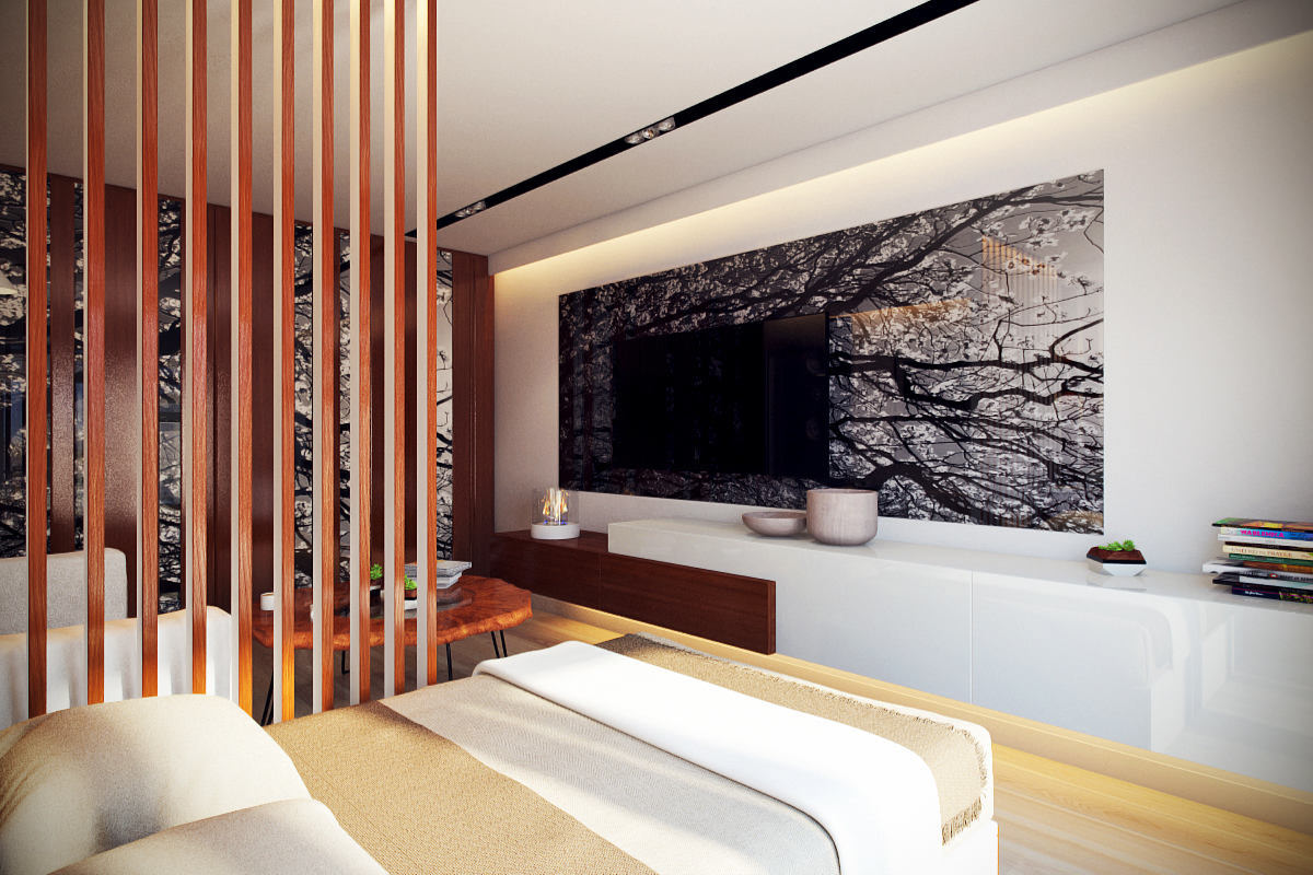 Separation zone apartments - a modern solution. Each part performs certain functions, the room becomes visually spacious, filled with comfort. Partitions between zones can be stationary and mobile type. The second design option, if necessary, easily changes its location.