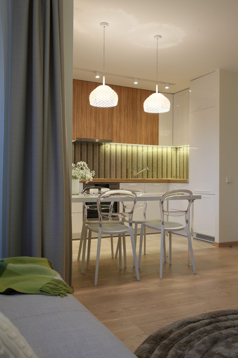 The visual division of the room into the living room and sleeping area is made of vertical wooden slats. They can change their position on the principle of blinds and, if necessary, visually hide a place to sleep.
