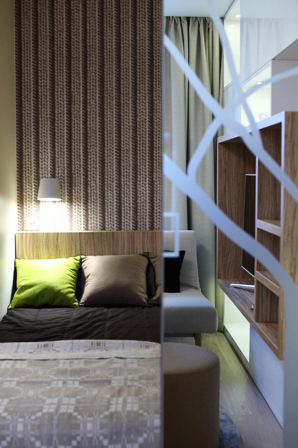 The berth is raised to the podium and separated from the living area by wooden slats, leaving the opportunity for visual contact with the rest of the apartment, while at the same time creating the illusion of privacy.