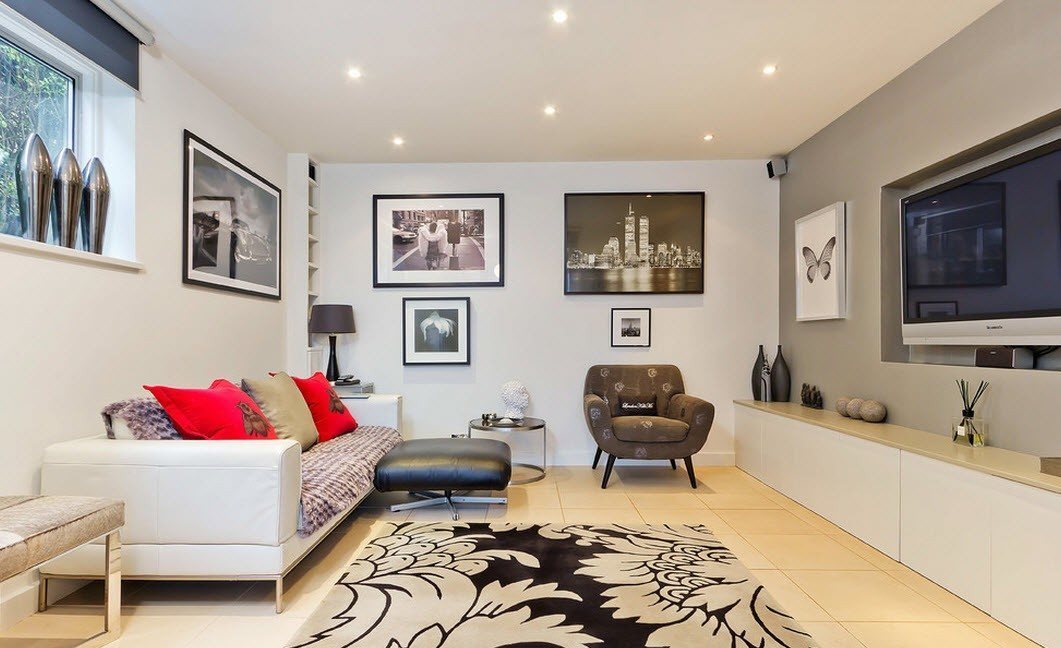 On the ceiling, LED lighting elements are placed, which are turned on separately, highlight the main areas of the room with light, obscure some corners of the apartment.