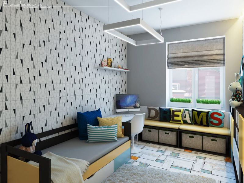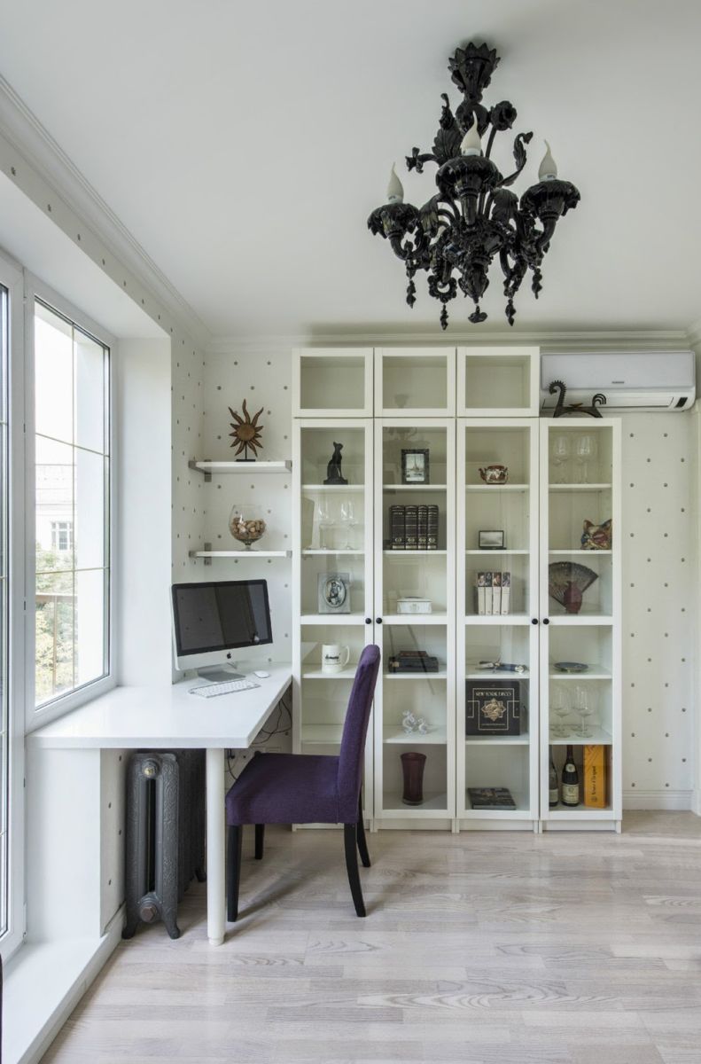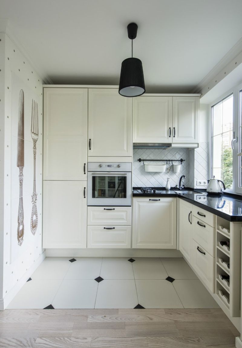 The flooring here will suit both tile and laminate. The texture should be smooth, glossy. The color scheme is light, not creating a load.