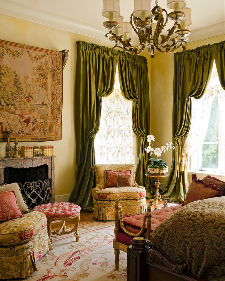The window is decorated with graceful Italian curtains, belted with lush interceptions. Additionally, the curtains are embroidered with bugles. The curtain is selected translucent, with the application of light sewn patterns.