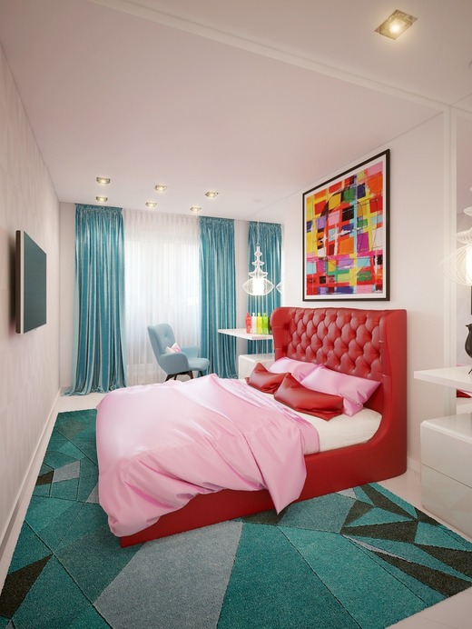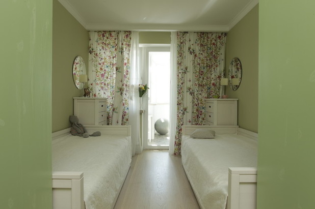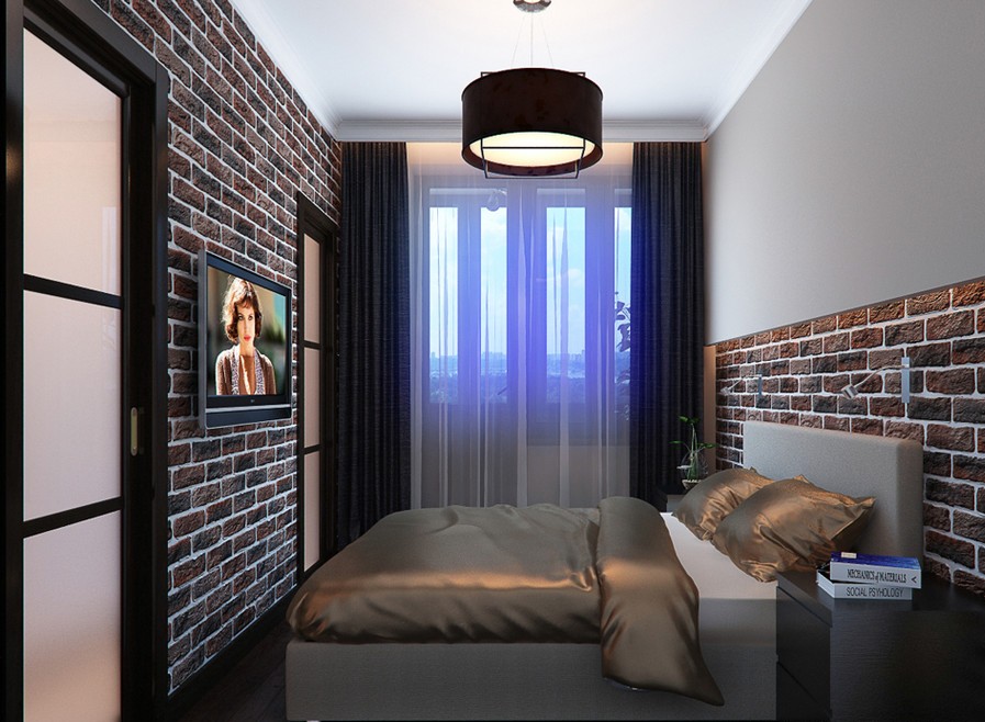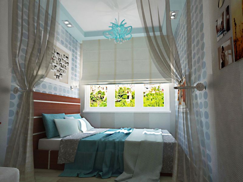 Finishing short walls must be done necessarily with bright colors. Plain wallpaper or glass wallpaper will fit in well, which can later be repainted. So interior design will not bother with time. The window opening must be curtained. To do this, choose Roman or roller blinds (for more details on choosing curtains, see our article), since the head of the bed does not allow the use of long fabrics (for example, Italian, Austrian).