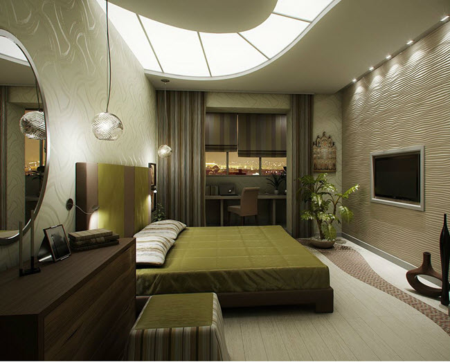 If there is no sofa in the bedroom, then the TV can be hung from the ceiling using a special mount. The only drawback of this solution is the presence of ugly hanging wires. Therefore, consider wiring well in advance of wall and ceiling decoration. In this case, it can be hidden under the plaster or curtain panels.