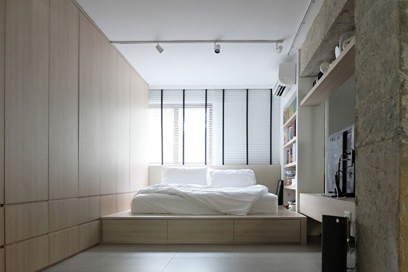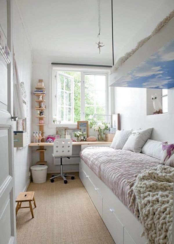 If the room is so narrow that it is impossible to choose a standard bed, you can purchase a mattress and make a wooden podium for it