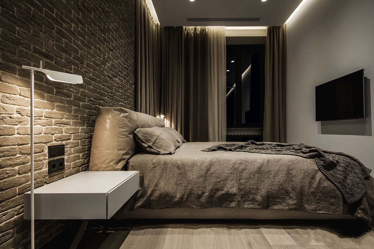 The combination of a white brick wall with smooth surfaces of a dark shade