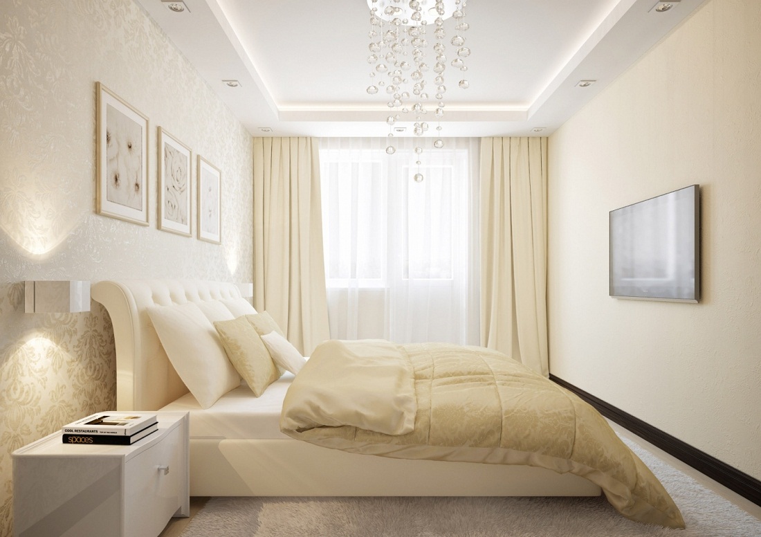 The ceiling space of a small room can be equipped with two levels. It is not necessary to make a standard perimeter rectangle. Such an arrangement will create certain frameworks that are completely unnecessary here. Instead, arrange the ceiling in two different halves. Use smooth lines. An interesting option would be the layout of the three components. At the same time, the middle part of the bedroom on the ceiling will be indicated by a certain “cavity”, which can be decorated with a different color from the rest.