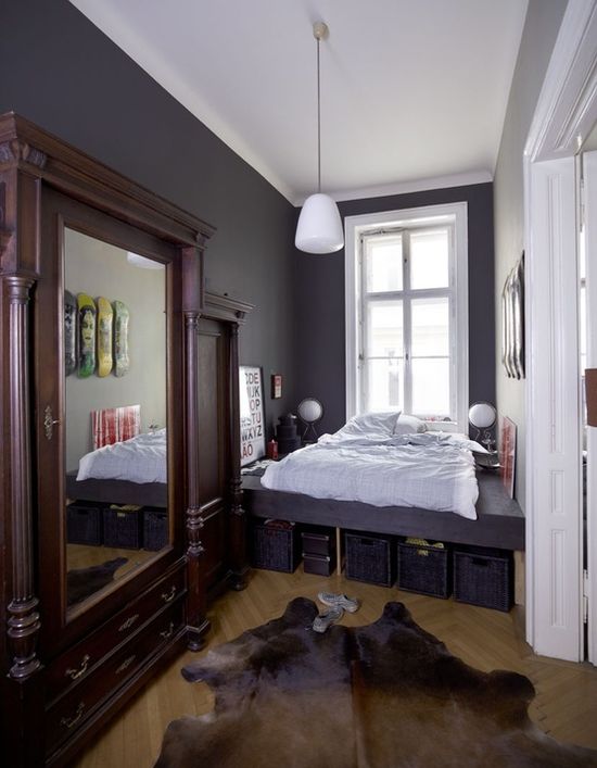 The combination of contrasting shades visually enlarge a small bedroom