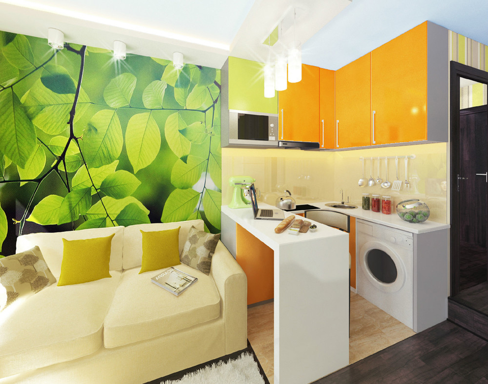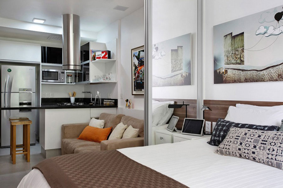 In the studio apartment it is not necessary to allocate a separate room for the kitchen. It is enough to install all the necessary household appliances at one wall. The dining table is selected folding. For example, which is hiding in a coffee table. In order not to interfere with sleep during cooking, a berth is made in a niche right behind the kitchen. Additionally, it is enclosed by sliding doors. Remember to take care of the lighting.
