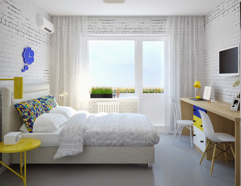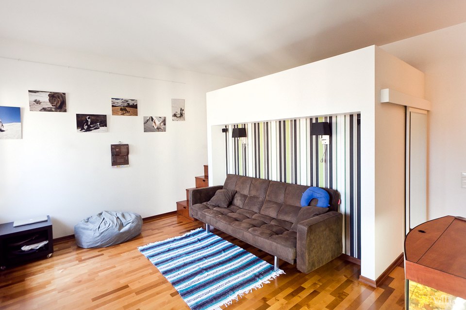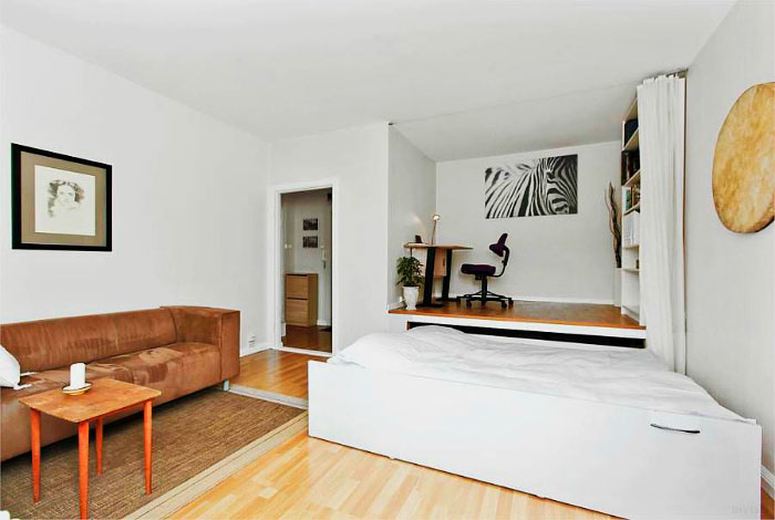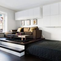 The organization of the podium is an excellent method of delimiting space. Place under the podium is used for cabinets for bed linen and clothes. Also, a pull-out bed fits perfectly here.