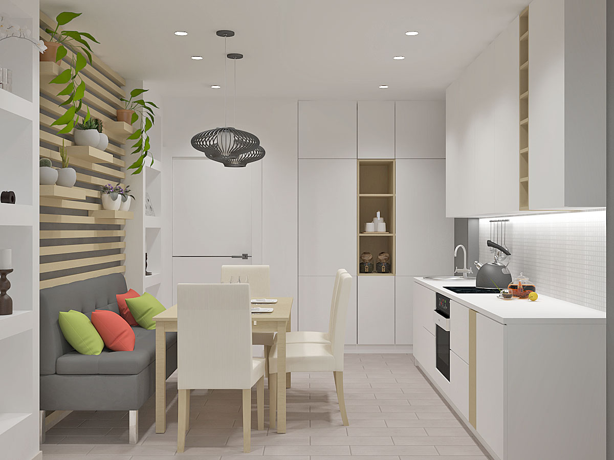The principles of decorating walls, ceiling and floor in the kitchen are the same as in the bedroom: light colors and the use of natural materials. In addition, mosaic tiles can be used for walls. For the floor, ceramic tiles are preferable, since the wooden surface is worse to clean.