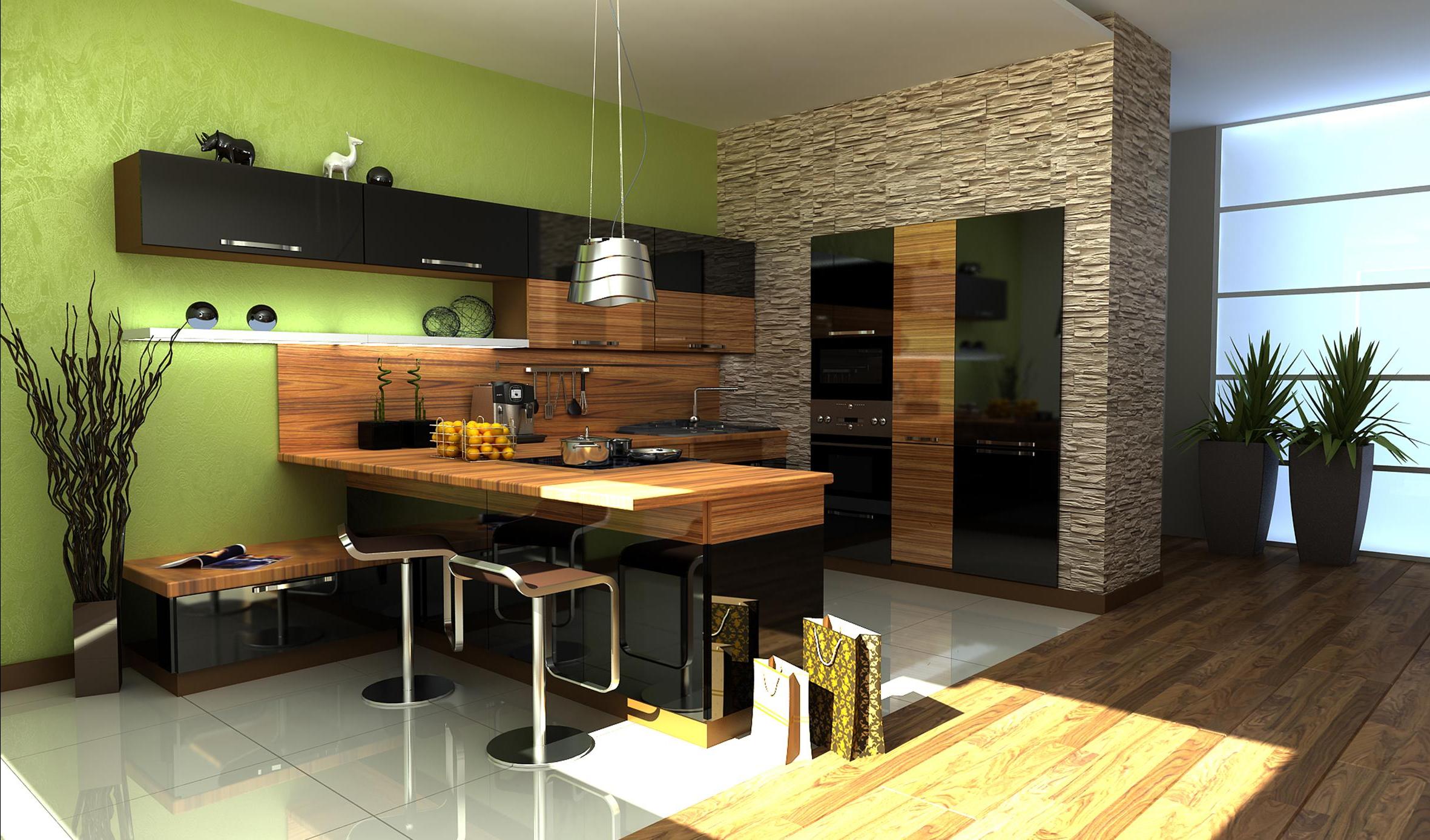 - The working wall is often decorated with brick or glass skins.