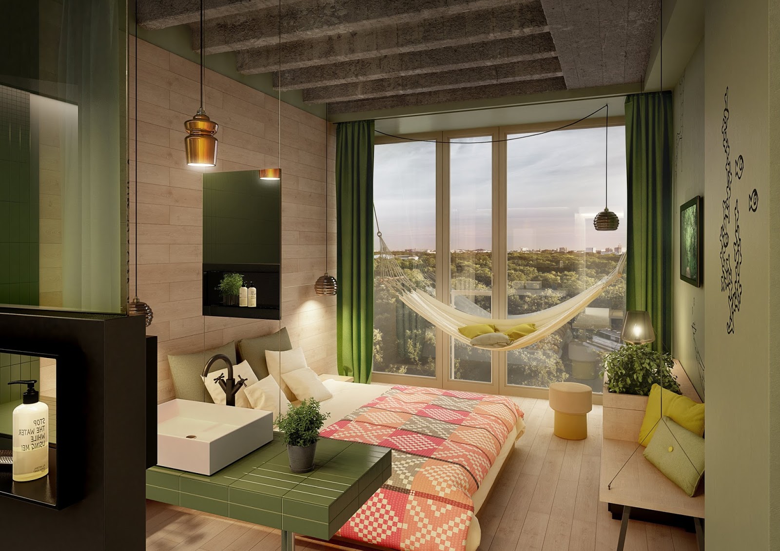 If you want to create an eco-friendly interior, then you have to arm yourself with green colors and fabrics. Having painted one of the walls in green, scattered green pillows in pillowcases made by yourself and carefully placing your favorite flowers in wooden pots on your windowsill, you are one step closer to the cherished design of the eco-style room.