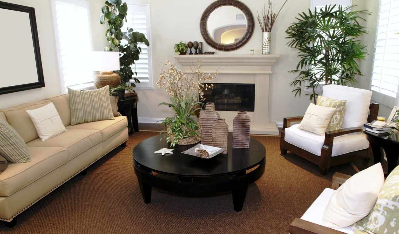 Coziness will help to create low upholstered furniture, covered with smooth fabric, as well as decorative pillows, rugs and lamps. A variety of models and materials allows you to show your imagination here. Interesting lamps made of wood and other natural materials will add some originality to the design of the living room.