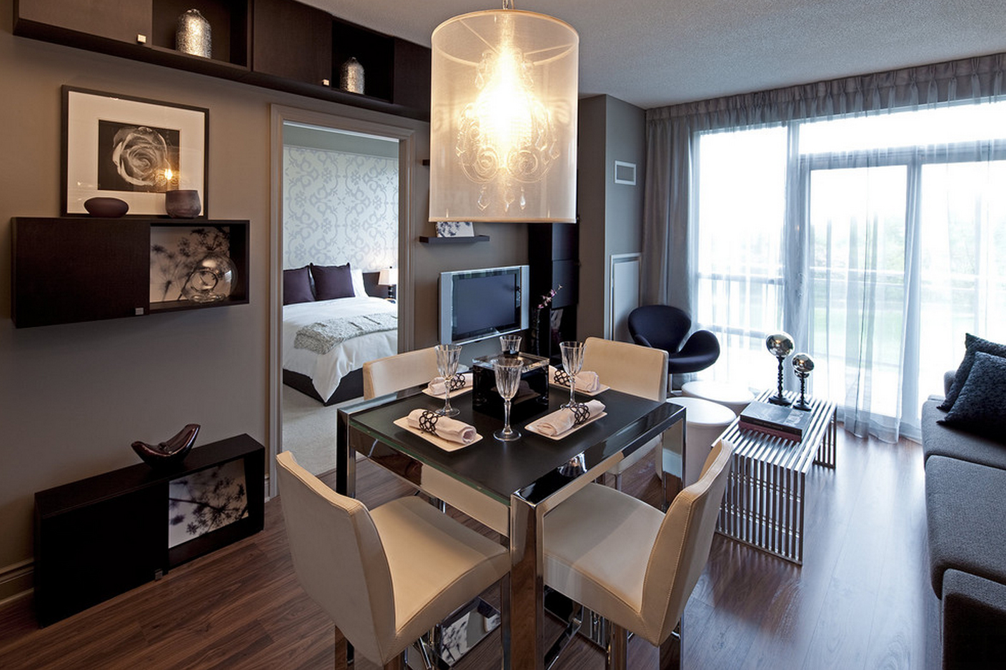 The environment of space directly depends on its functions. If this bedroomthen a bed is required. In the living room there is a sofa, TV, coffee table. Furniture should be the most necessary and oversized. Otherwise, a feeling of clutter will be created, the space will visually narrow.