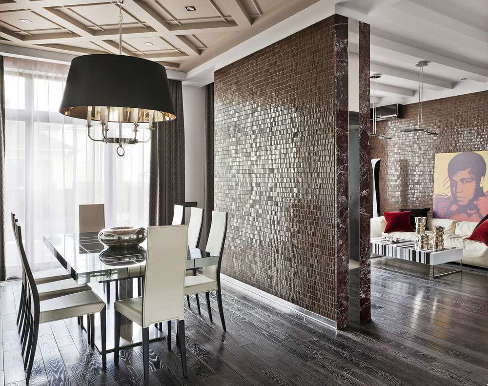 One of the simplest and most beautiful solutions in execution is color lighting of different saturations. The guest area can be brightly lit with standard white, the dining area with soft blue, etc.