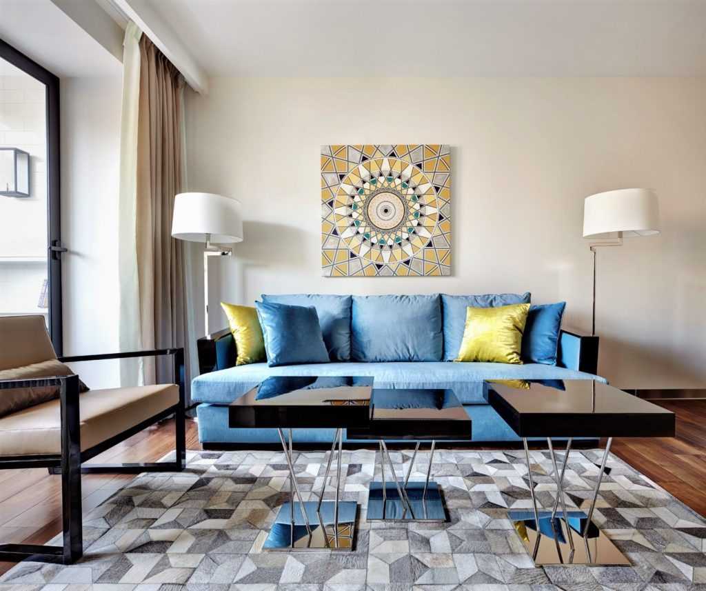 In the living room it can be combined with white or pastel shades. In this case, it is better to take pale blue tones. Bright blue is recommended to combine with bright, saturated colors. Turquoise, complemented by gold trim or a chocolate shade will create a ceremonial, solemn, luxurious interior.