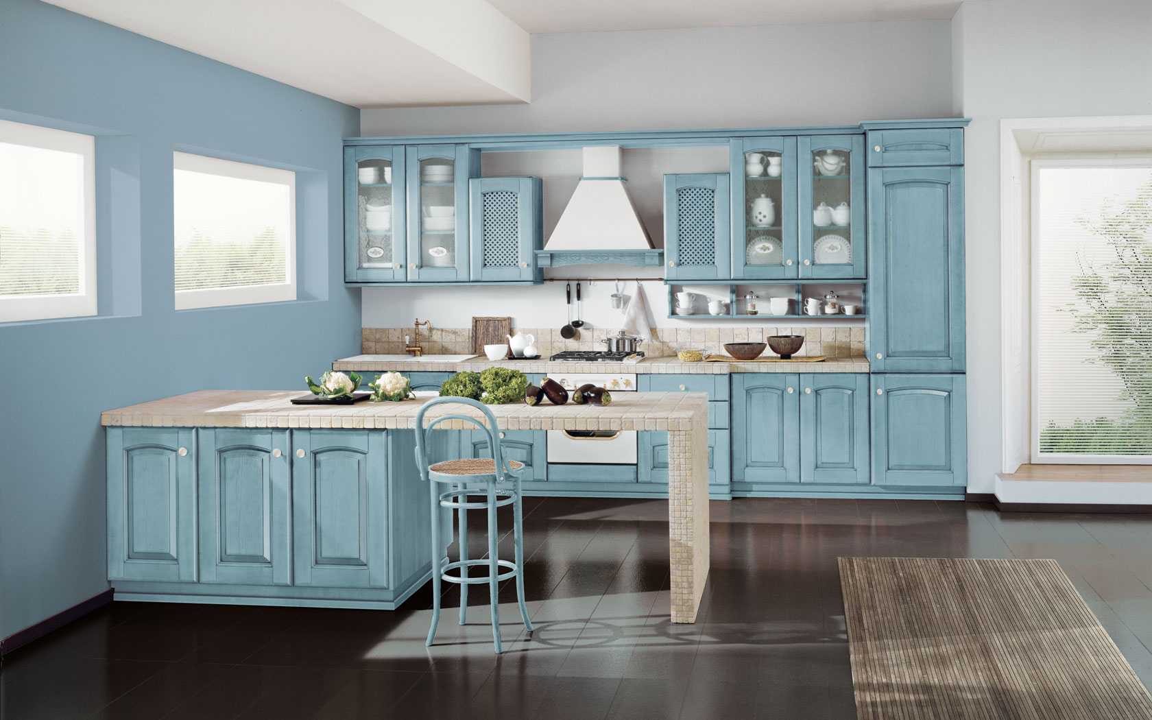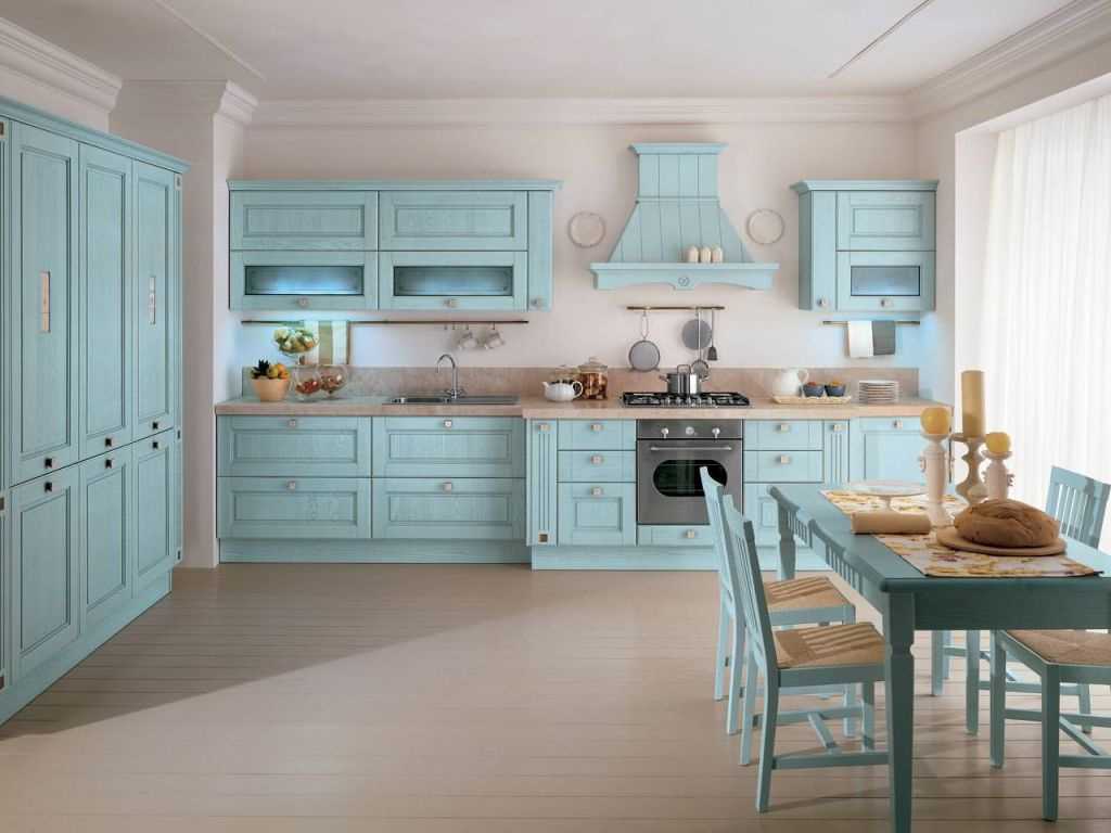 Provence - gentle rustic style loves the blue color. The Provence style kitchen is tender, reminiscent of a grandmother's house in the village. A light floral pattern on wallpaper in blue tones (combinations of blue and pink or salad color are possible) can be supplemented with delicate white and blue dishes - for example, a tea set with blue flowers will look nice.