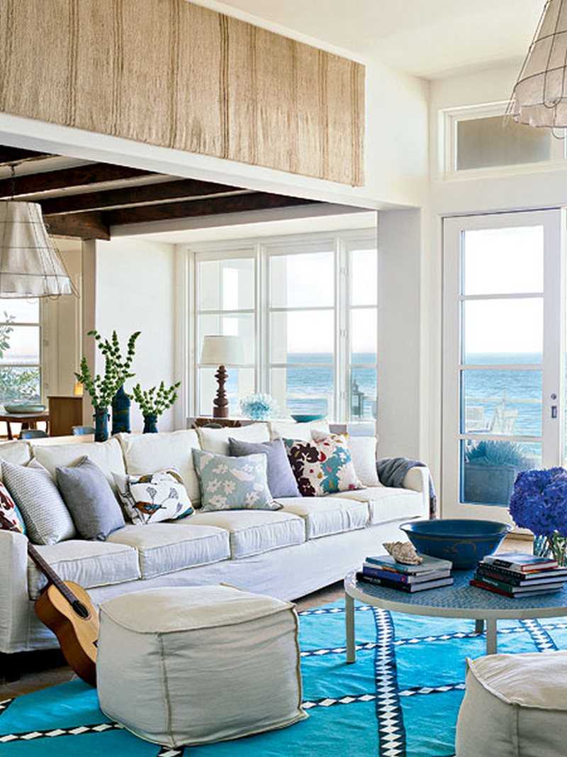 Something in such an interior must necessarily be striped - if not walls and upholstery of upholstered furniture, then at least sofa cushions. Walls can be monophonic, both blue and light, pastel colors. Then the furniture can be of the same shade, and bright colors are selected for curtains (double curtains combining both tones - primary and secondary) are ideal. We will place the accents in the form of paintings or photos in bright frames, a table or floor vase, sofa cushions, a rug on the floor.