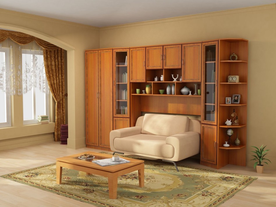 Equipping small living roomPrefer compact and functional of furniture. AT the living room first you need to choose sofa, since he occupies a central position here. In this case, you can choose a large item if the style requires it (as, for example, classic). Then you have to sacrifice other elements: an armchair or a puff.