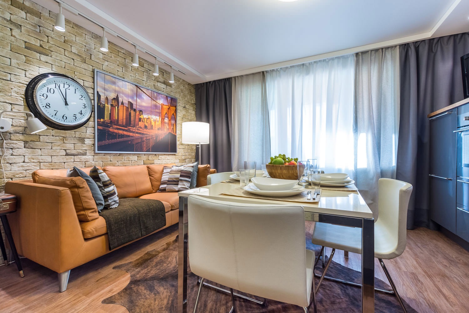 In an apartment with a small kitchen, the dining area is often taken out to the living room. This is a full dining table with chairs or a wide coffee table near the sofas.