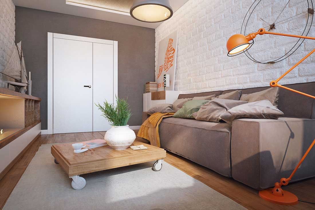 - attractive but unobtrusive living room design of 16 sq.m .;
