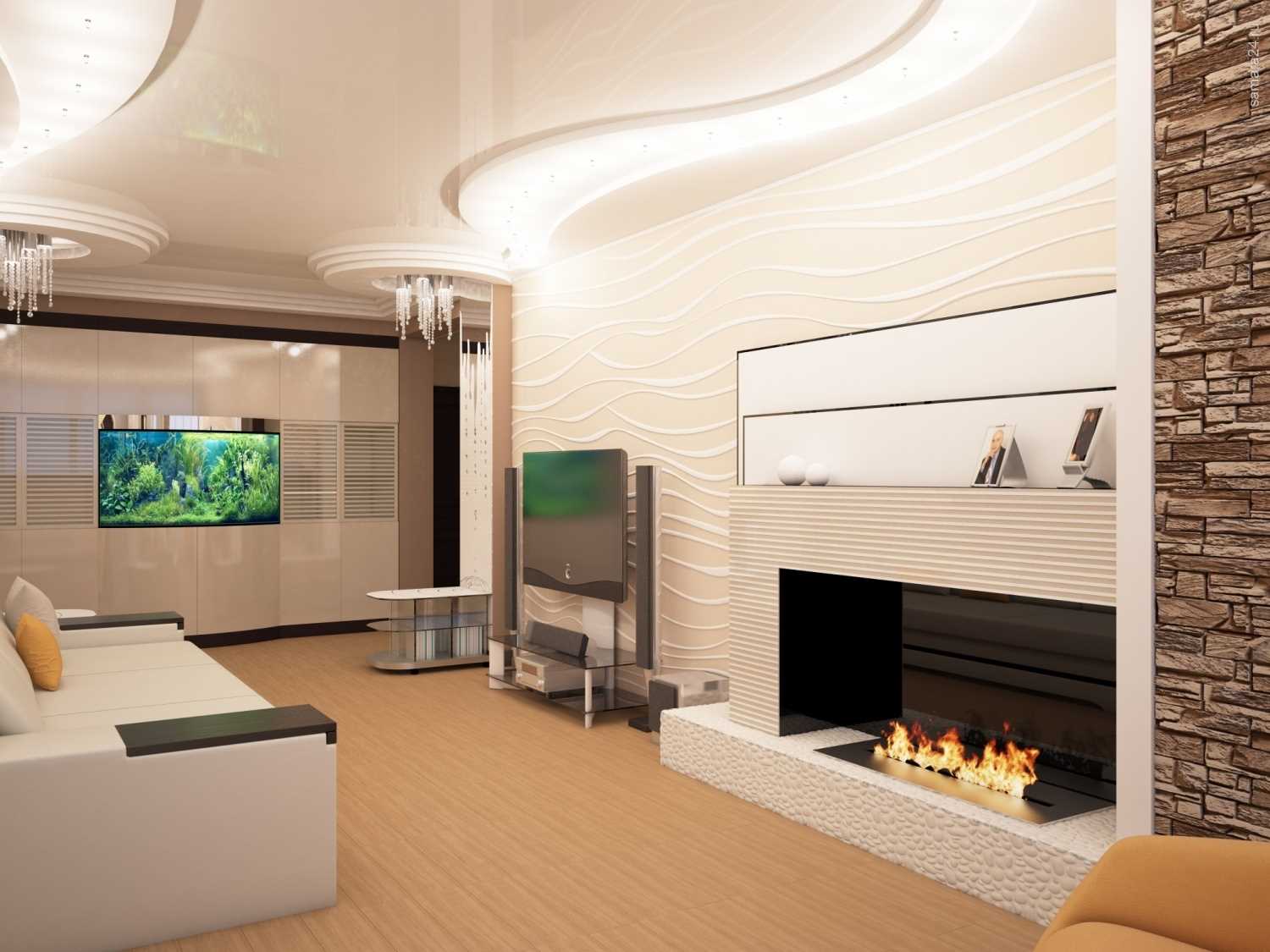 - Modern. Recommended to embody in a square living room. Place the fireplace in a corner or along one of the walls. It is worth using designs with irregular lines;
