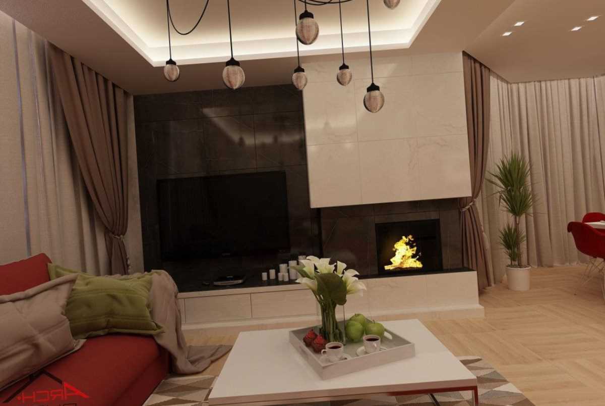The interior of the living room with an electric fireplace is a safe and original solution. Be prepared that you will not get much heat from it. It is important that the electric fireplace fits into the overall design of the room. The most suitable are country and high-tech styles. In front of the fireplace it’s worth installing a small table and a sofa on which it will be convenient to relax.