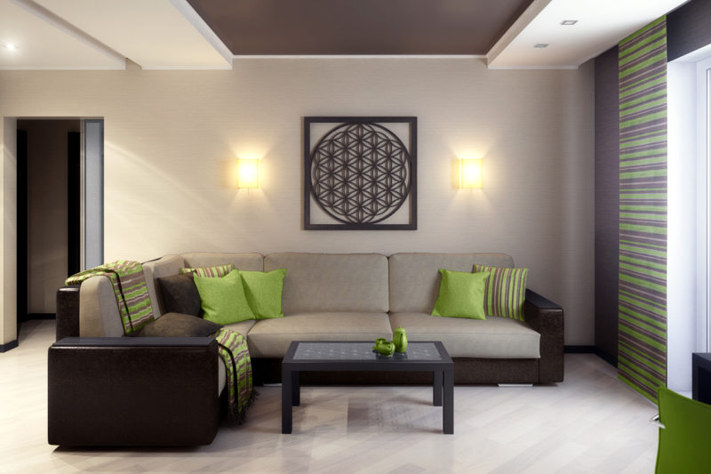 The first involves placing one lamp in the center of the ceiling living room. It should be small in size, with a minimum height and simple in geometry. The absence of jewelry on it will allow the light to scatter well around the perimeter. The interior will be calm and romantic.