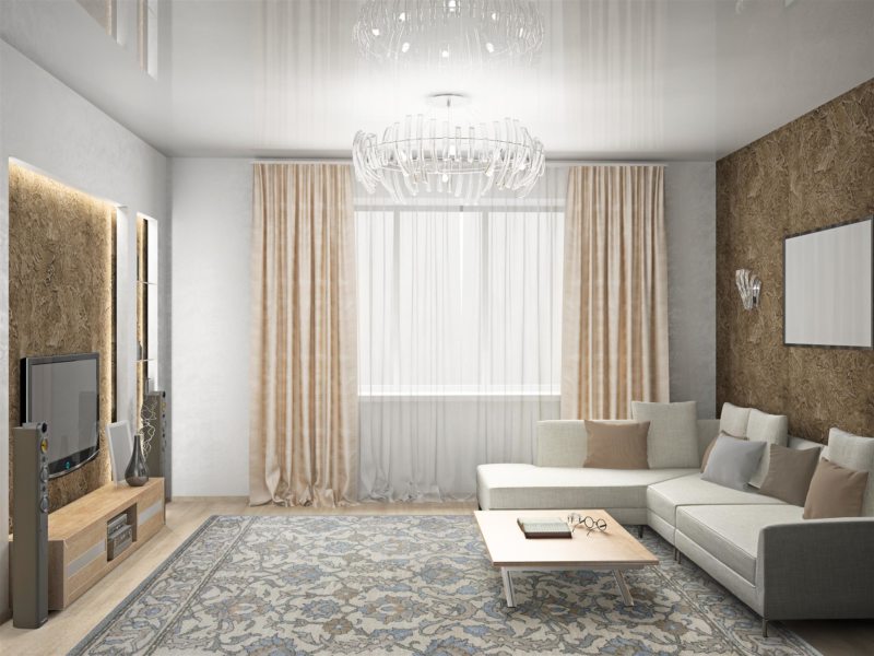 Furniture set near long walls. Moreover, it is as narrow as possible. It is appropriate to use a carpet with stripes parallel to the short the walls. This allows you to visually increase space.