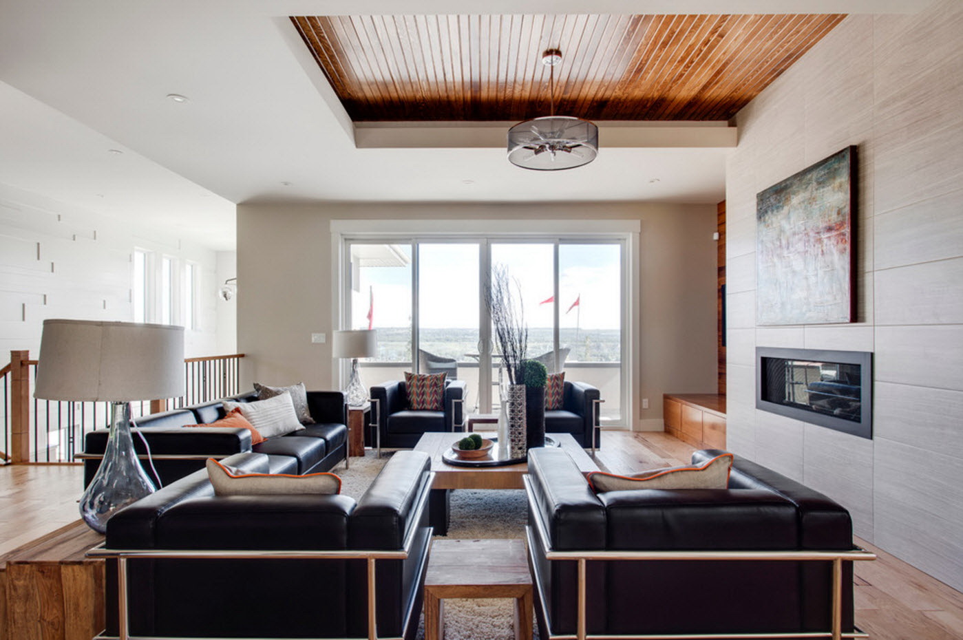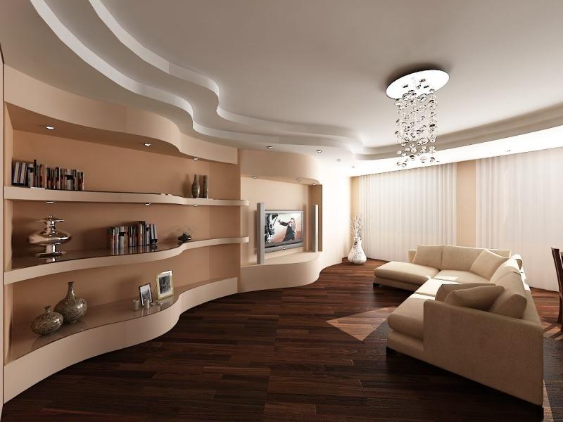 Choosing the right material will help highlight the positive aspects of the room and hide the flaws. For example, a stretch glossy ceiling is often used for a small living room because of its ability to illusorily increase the size of a room. For a large hall, multi-level structures are suitable, thanks to which you can visually divide the room into zones.