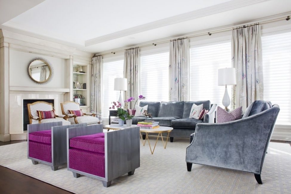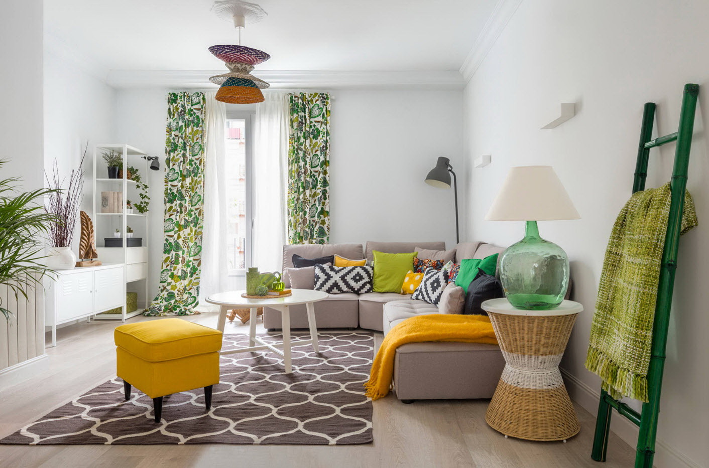 Bright motley curtains and textiles are suitable for the living room, which will create a relaxed atmosphere for relaxation and give lightness. The type of fabric and color must comply with the rest of the decor.
