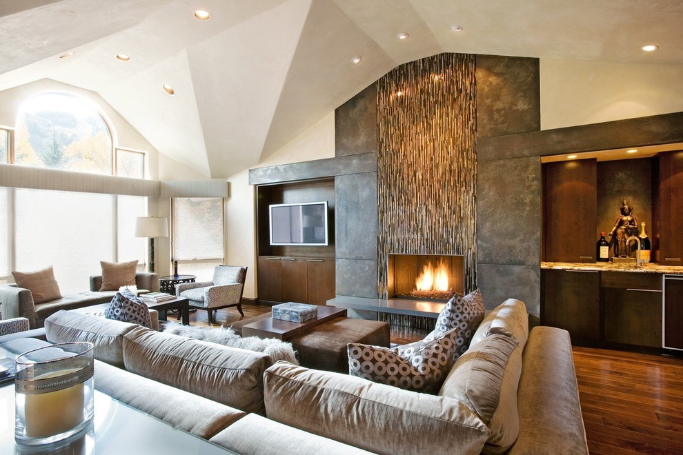 At the moment, there is a large assortment of fireplaces from various materials and colors. It is best to take a light shade so that it does not press on the room. A picture will ideally look above the fireplace, but on the contrary it is imperative to place a coffee table and several armchairs or a sofa.
