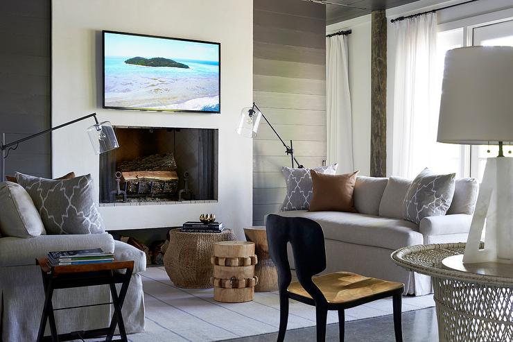 Living room studios with zonal furniture can be equipped with your own island, two-sided or built-in model of the hearth. A fireplace in the form of a partition between the dining room and the sitting area will allow you to rationally divide the room and use the device to heat and illuminate the entire studio space. A small model can be integrated into the false portal under the TV opposite the soft headset.