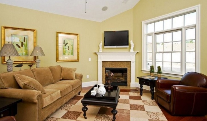 When installing a fireplace in the interior of the living room, the ratio of the area of the room to the size of the device should be taken into account. The proportions of the furniture and stylized heater should be harmoniously combined with each other. In a room with an area of less than 25 m2, it is more appropriate to install a small corner fireplace, as in the photo.