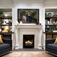 The classic design of the living room requires adherence to style when choosing interior items. Baroque, Rococo, Victorian, Renaissance are distinguished by relief stucco molding with gilding and complex floral ornaments. Twisted pilasters, carved porticos and crowns made of polyurethane molding stylized as gypsum, marble or wood are used as false panels for a built-in or recessed electric fireplace. Its shape should correspond to the classical canons - a rectangular portal with an open firebox (photo).
