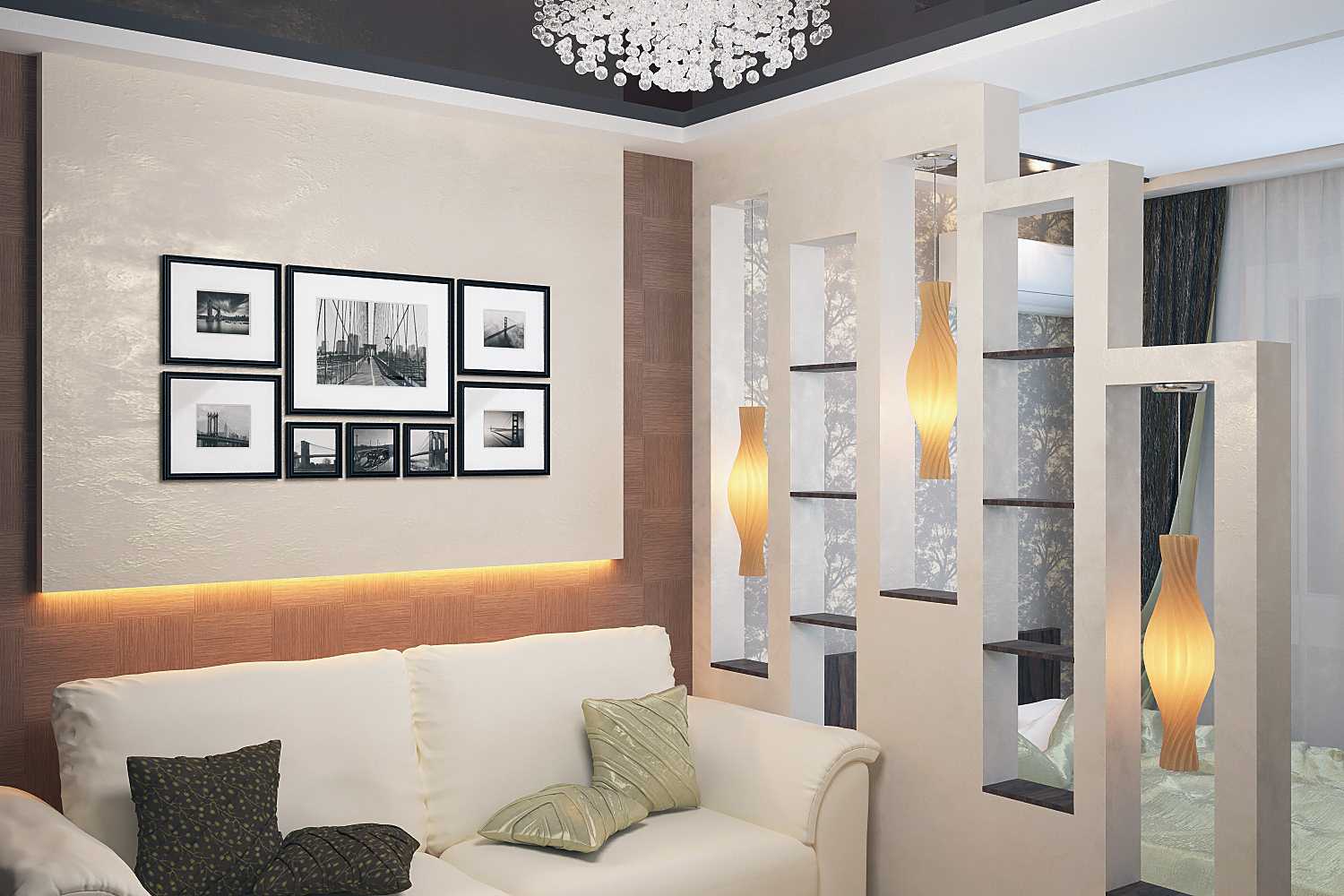 - Particular attention during zoning is given to artificial light. In the living room and sleeping area of the apartment, different lighting is necessary - in the sleeping area, as a relaxation area, it is softer, muffled. For the living room - a brighter light. This type of separation involves the complete absence of any barriers between the living room and bedroom. Separate areas are open to the eyes of anyone. Sometimes separation occurs by combining furniture elements into a single system. A sofa, two armchairs can serve as a finished composition, and the headboard - the border between the living room and sleeping area.