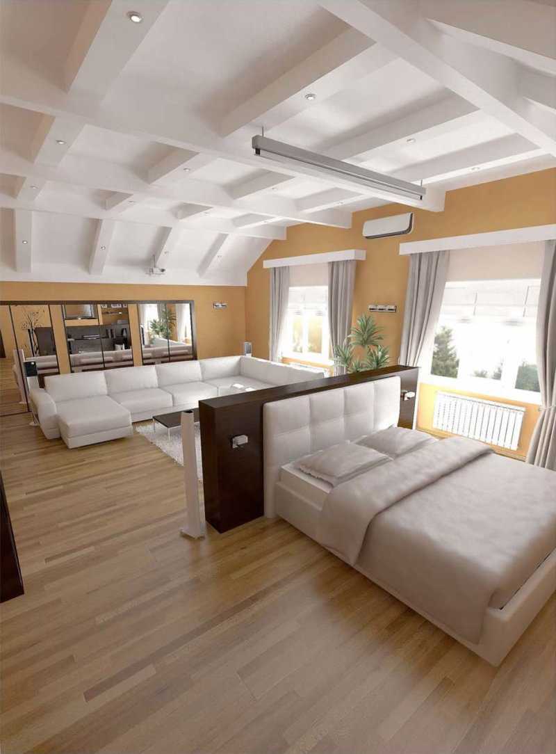 - Another type of zoning involves a mezzanine, a kind of second floor apartment, or a bed under the ceiling. This option is suitable for rooms with high ceilings. In houses with low ceilings, a bedroom equipped on an elevated floor will occupy exactly the same amount of space as if it were located on the ground. The bedroom under the ceiling, separated by a curtain or curtain, may very well become that cozy corner of the personal space, which all owners of small apartments seek so much to seek. The bed, located on an elevated podium, is also considered a mezzanine bedroom. A bed-podium can simultaneously be a transforming bed: a bed, a writing desk and a dining table, drawers used to store clothes and bed linen are placed on the podium.