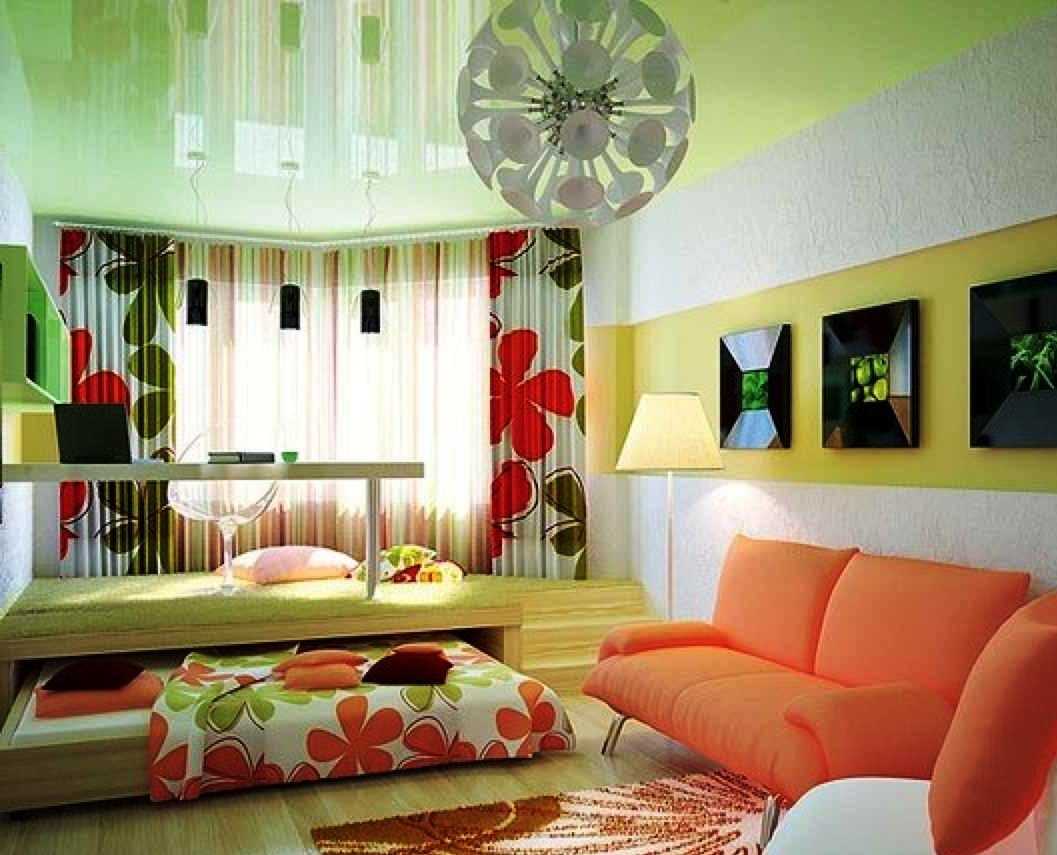- In order to make the room area seem larger, as well as to isolate different zones, the living room and bedroom are decorated in different styles and colors. In this case, do not get carried away, placing soft armchairs in the living room by the fireplace, and in the bedroom give preference to hi-tech or folk color. However, correctly selected color schemes will help visually divide the space, visually enlarge the living room and bedroom, give a special atmosphere and comfort to each of the residential parts.