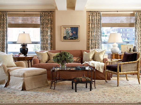 Peach-colored curtains will successfully fit into the monochrome interior of a beige living room