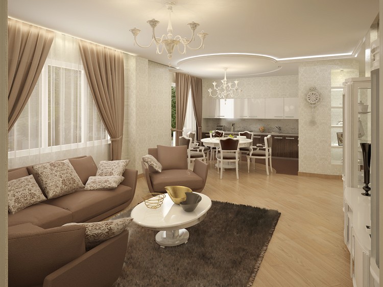 A classic interior built in a stylish combination of beige and dark brown
