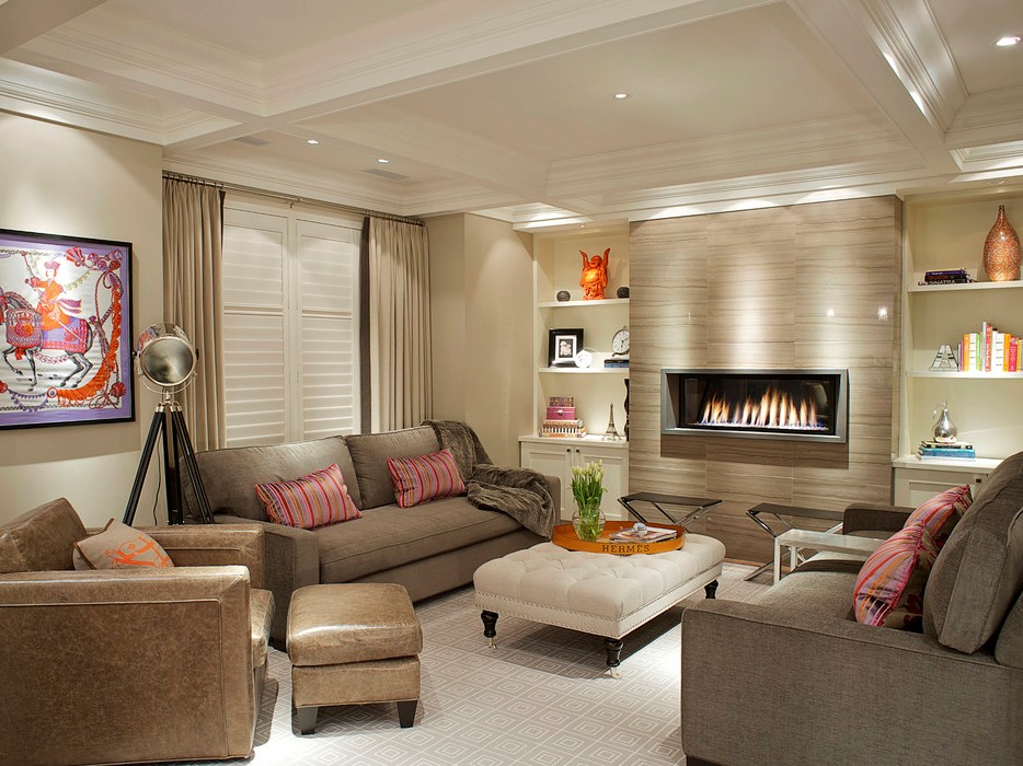 Using accents in a beige living room is highly appropriate. To do this, for example, custom lighting is used, sofa textiles. If we approach the issue of accentuating arrangement more broadly, we can consider the architectural composition with a fireplace topped with majestic columns of the Doric order.